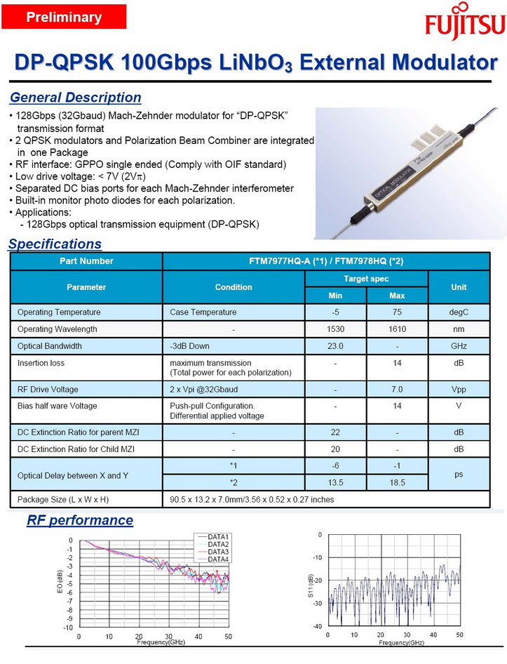 100Gbps PM-QPSK Modulator, Fujitsu FTM7977HQA, Lithium Niobate DP-IQ Modulator