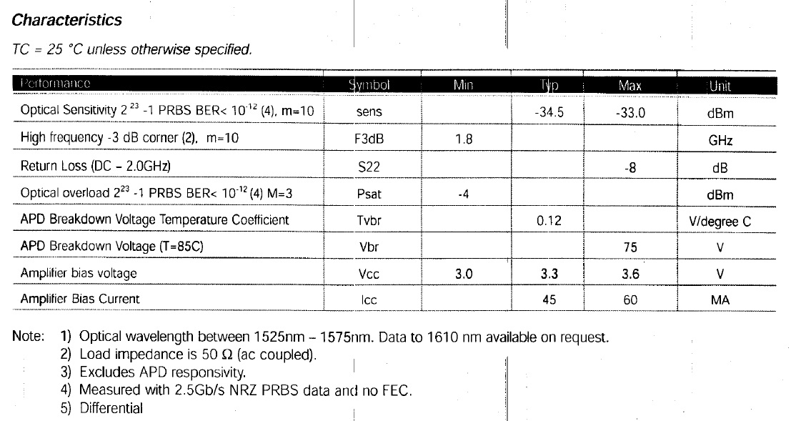 2.5Gbps APD Preamp Receiver, Bookham (Oclaro) AT3GC, Fiber Coupled Photo-Detector