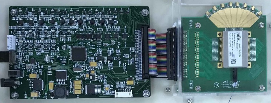 相干接收机评估板套件, 工作于C波段, 可用于 QPSK / PM-QPSK / BPSK / 4QAM, 16QAM光信号的解调与探测. 整个评估板分为供电主控板和高速射频信号扇出板. 其中主控部分包含PD偏压控制, 及TIA增益控制, AGC与MGC切换, 输出幅值调整等功能, 射频转换板主要实现4路高速IQ模拟信号的扇出. 非常适合从事相干通信的研究开发单位使用.