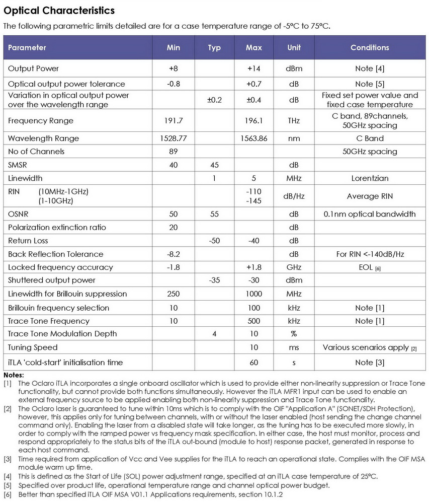 The iTLA implements the Oclaro DSDBR wideband tunable laser. This laser is a fully monolithic InP chip designed for high volume, low cost manufacturing. With no moving parts, it is a low voltage electronically tuned device enabling rapid wavelength switching with straightforward control electronics. The integrated semiconductor optical amplifier (SOA) provisions the optical power control and also acts as a shutter to allow dark tuning when reverse biased.