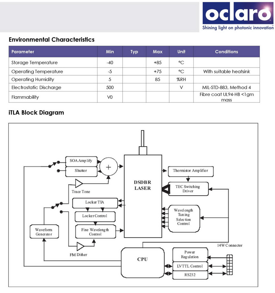 The Oclaro Lambda FLEXTM iTLA is a high performance continuous wave (CW) tunable laser source for use in the C-band window covering 1528nm to 1563nm. Based on the OIF iTLA standard, the laser and control electronics are pre-mounted on a dedicated circuit board for easy production installation. The iTLA features variable power, shuttered tuning, trace tone and FM dither circuitry. Comprehensive control and system reporting is provided over the RS232 interface.