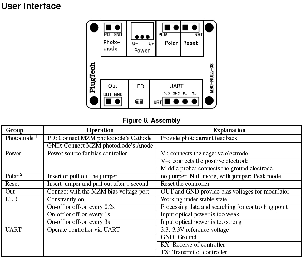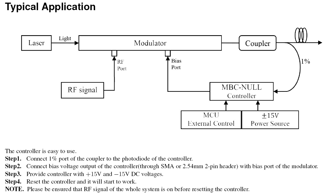 本偏压控制器适用于MZ型的铌酸锂电光调制器, 令调制器工作在NULL或者PEAK点上, 能实现超高消光比, 工作稳定可靠且易用. 适合布里渊类型的传感系统, ROF通信, 脉冲生成和载波抑制等应用.