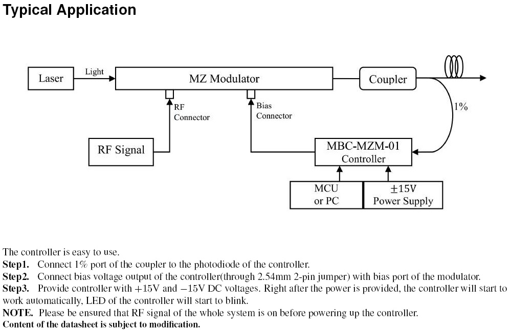 Modulator bias controller is specially designed for Mach-Zehnder modulators to ensure a stable operation state in various operating environments. Based on its fully digitized signal processing method, the controller can provide ultra stable performance.