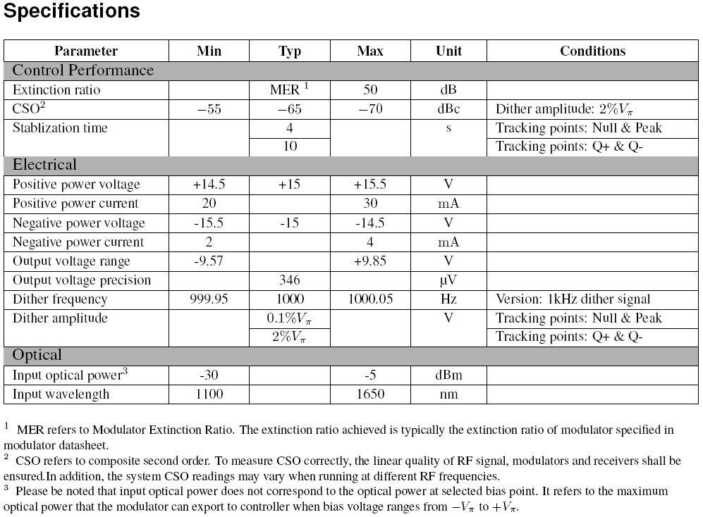 • Low dither amplitude: 0.1% Vπat NULL mode and PEAK mode; 2% Vπ at Q+ mode and Q- mode