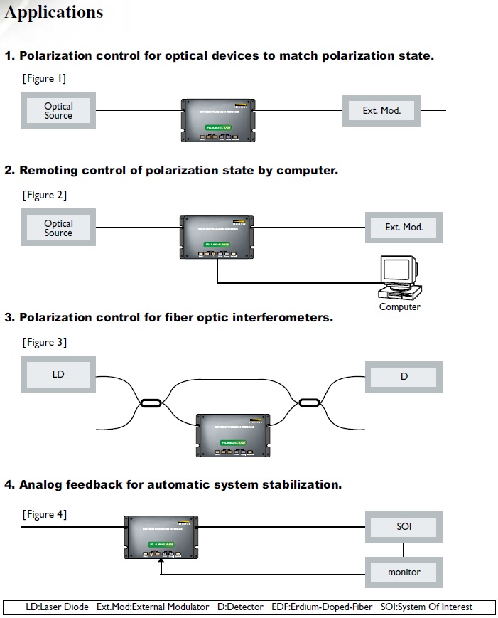 PC1300自动偏振控制器是被用来远程控制和手动调试其偏振态的设备。光纤四分之一波长的波片被马达驱动。既可以通过带模拟电压输入的远程控制,也可以通过RS232远程控制旋转波片的角度位置。自动偏振控制器还提供传统的“保存和记忆”的功能,它也提供自动扫描模式和的可变扫描速度。其低插损(低于0.5dB)和高消光比。它具有超紧凑的结构,便于内置于系统中。
