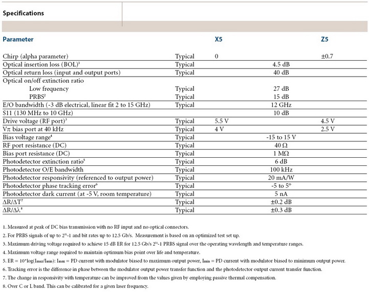 10Gbps强度调制速率,单GPO射频口. 4.5dB低插入损耗, 消光比≥30dB,消光比最高可超过40dB 或 50dB. 低驱动电压. X5和Z5同为10Gbps强度调制器, 最大的区别在于后者具有固定啁啾.