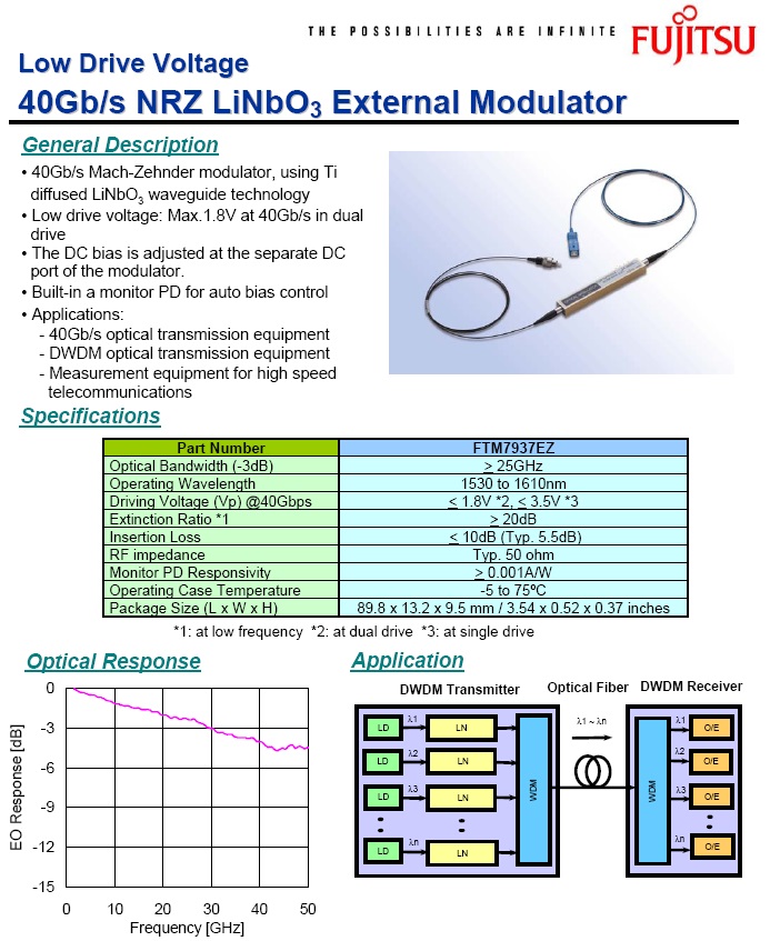 富士通FTM7937EZ双臂RF驱动, 适用调制格式DPSK/NRZ, 马赫泽德调制器,最高速率可达40Gbps; 低电压驱动; C+L波段工作, 高消光比.