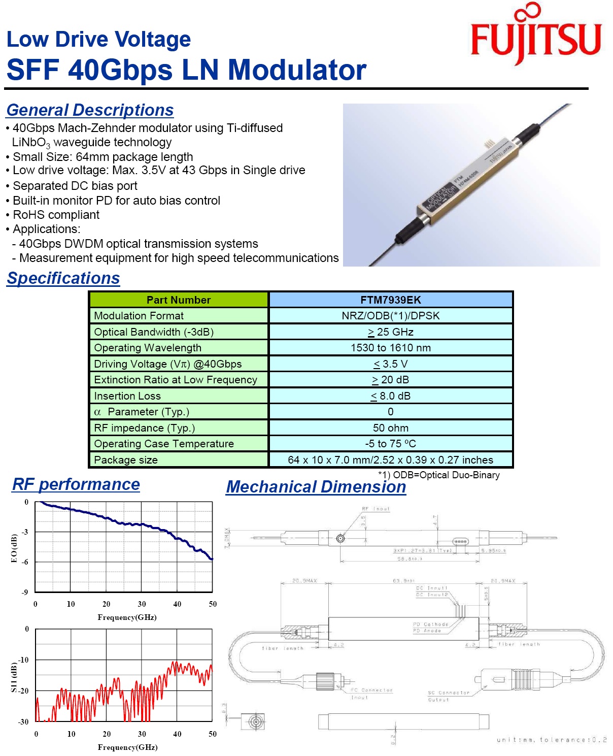 富士通FTM7939EK单臂RF驱动马赫泽德调制器, 适用调制格式DPSK/NRZ, 最高速率可达40Gbps, 极低的插入损耗5dB以下; 低电压驱动;C+L波段工作, 高消光比. 紧凑型, 小尺寸.
