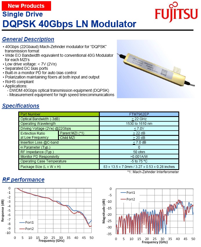 40Gbps DQPSK Modulator, Fujitsu FTM7962EP, Lithium Niobate Fiber IQ Modulator