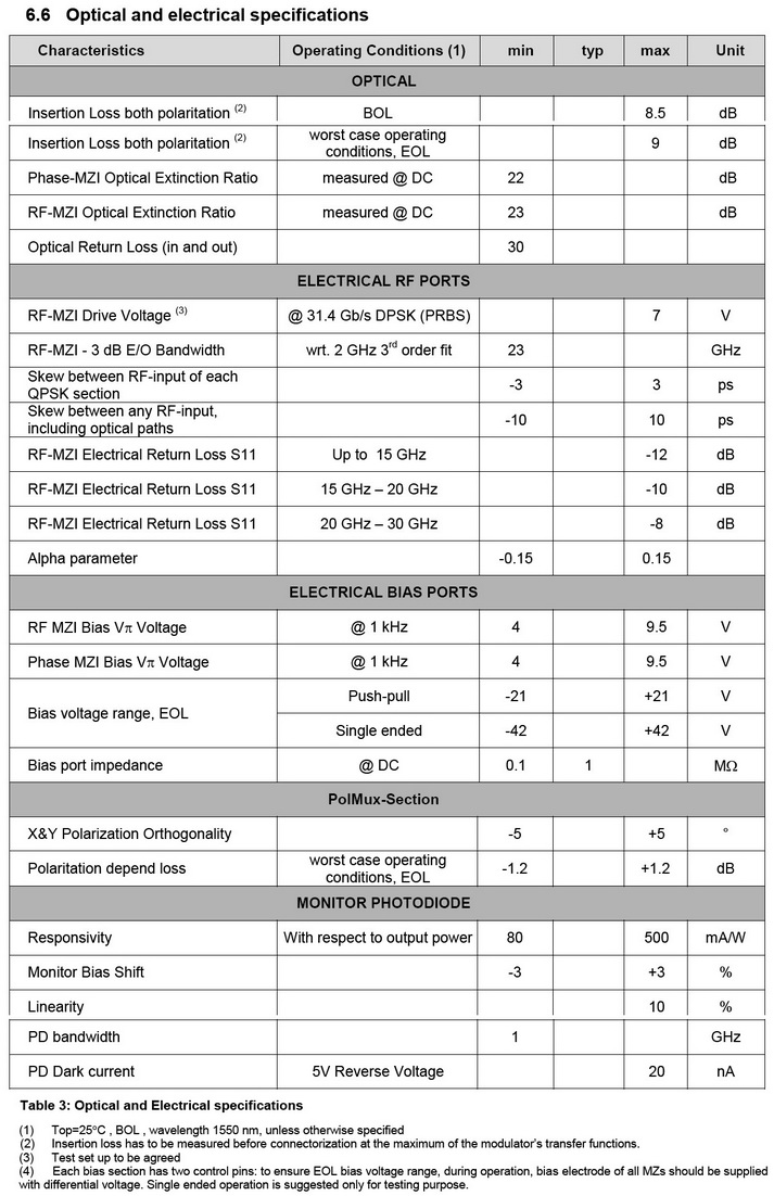 DP-QPSK马赫泽德调制器, 四臂RF驱动, 适用调制格式DP-QPSK; 保偏输入输出,最高速率可达128Gbps; C+L波段工作.
