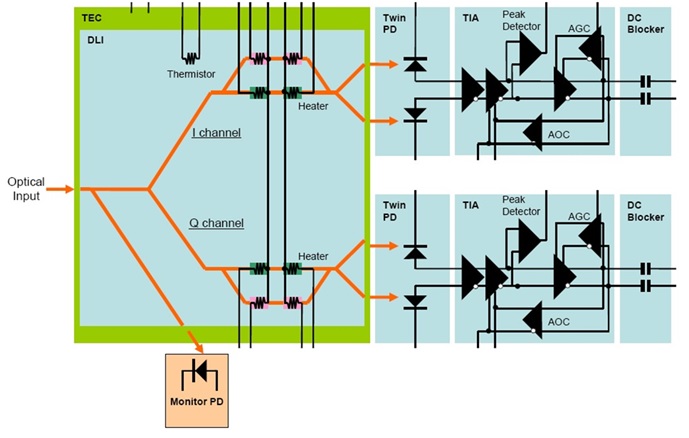 富士通FIM24202自相干解调接收模块, 内部集成光延迟解调器以及高带宽平衡探测器和跨阻放大器. 是DQPSK解调和探测的一体式小型化解决方案, 具有非常高的性价比.