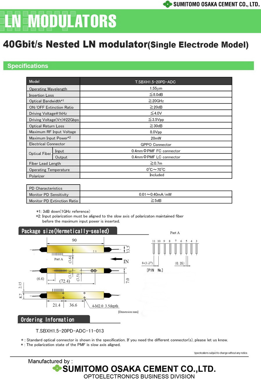 T.SBXH1.5-20PD-ADC双臂RF驱动, 适用调制格式DQPSK; 马赫泽德调制器,保偏输入输出,最高速率可达40Gbps; 低电压驱动;C+L波段工作, 高消光比; IQ调制器又称QAM调制器, 可工作于4QAM, 16QAM, 64QAM调制格式, 其中4QAM的调制就是我们常说的IQ调制. 此外IQ调制器可用于SSB-CS(单边带载波抑制)传输. 注: Sumicem是Sumitomo住友集团的光电子部门, 这两种LOGO均可能出现光器件资料或产品标签上.