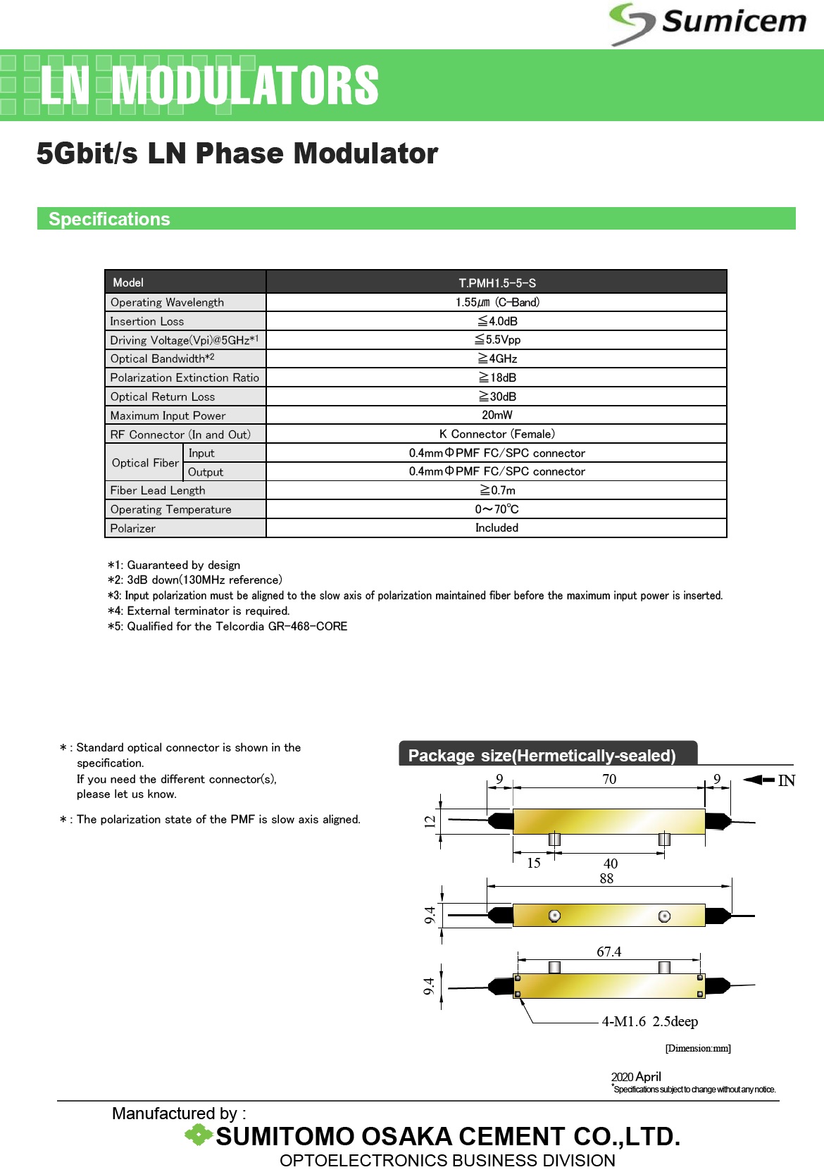 本光纤相位调制, 工作于1550nm, C波段, 带宽大于4GHz, 典型值5GHz, 具有低半波电压,低插损特点, 输入输出保偏光纤. 适用于边带抑制, 干涉型传感, 全光频移, 数据加密以及高速光通信的啁啾控制等应用. 注: Sumicem是Sumitomo住友集团的光电子部门, 这两种LOGO均可能出现光器件资料或产品标签上.