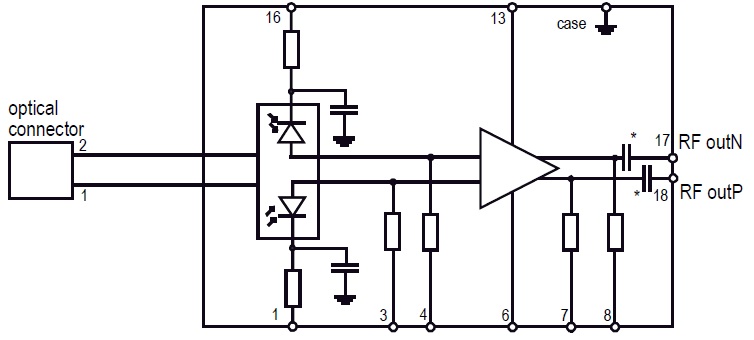 - Dual optical input, differential RF output with voltage swing of Max.600mW