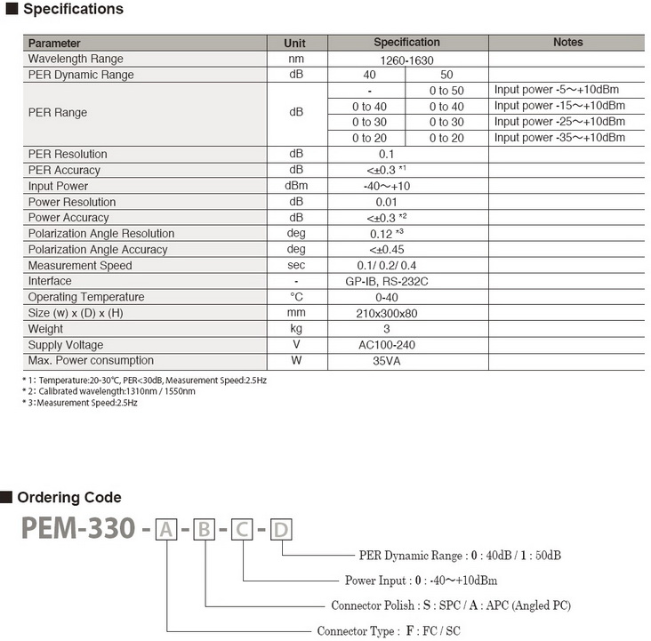PEM-330是SANTEC推出的第一款偏振消光比测试仪, 工作在1260~1630nm的波段范围, 实时测量刷新率10Hz, 动态范围40dB和50dB可选. 适用于保偏器件的对轴, 保偏光纤耦合的激光二极管的偏振特性评估, 以及保偏光纤的熔接效果测试.
