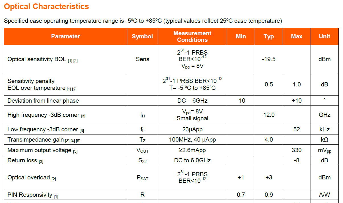 带光纤尾纤输入, 速率可达14Gbps, 内置低噪声跨阻限幅放大器,可用于数字光纤通信; 灵敏度可达-19.5dBm, 饱和光功率+3dBm, 可工作于O, C和L波段.